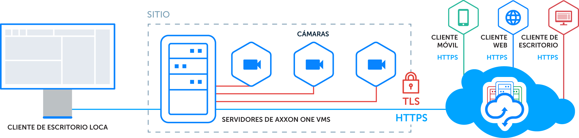 Servidores locales de software de gestión de video (VMS) en el sitio que pueden configurarse y supervisarse a través de la nube (interfaz web, aplicaciones móviles) o de forma local (cliente complejo, thick client):
